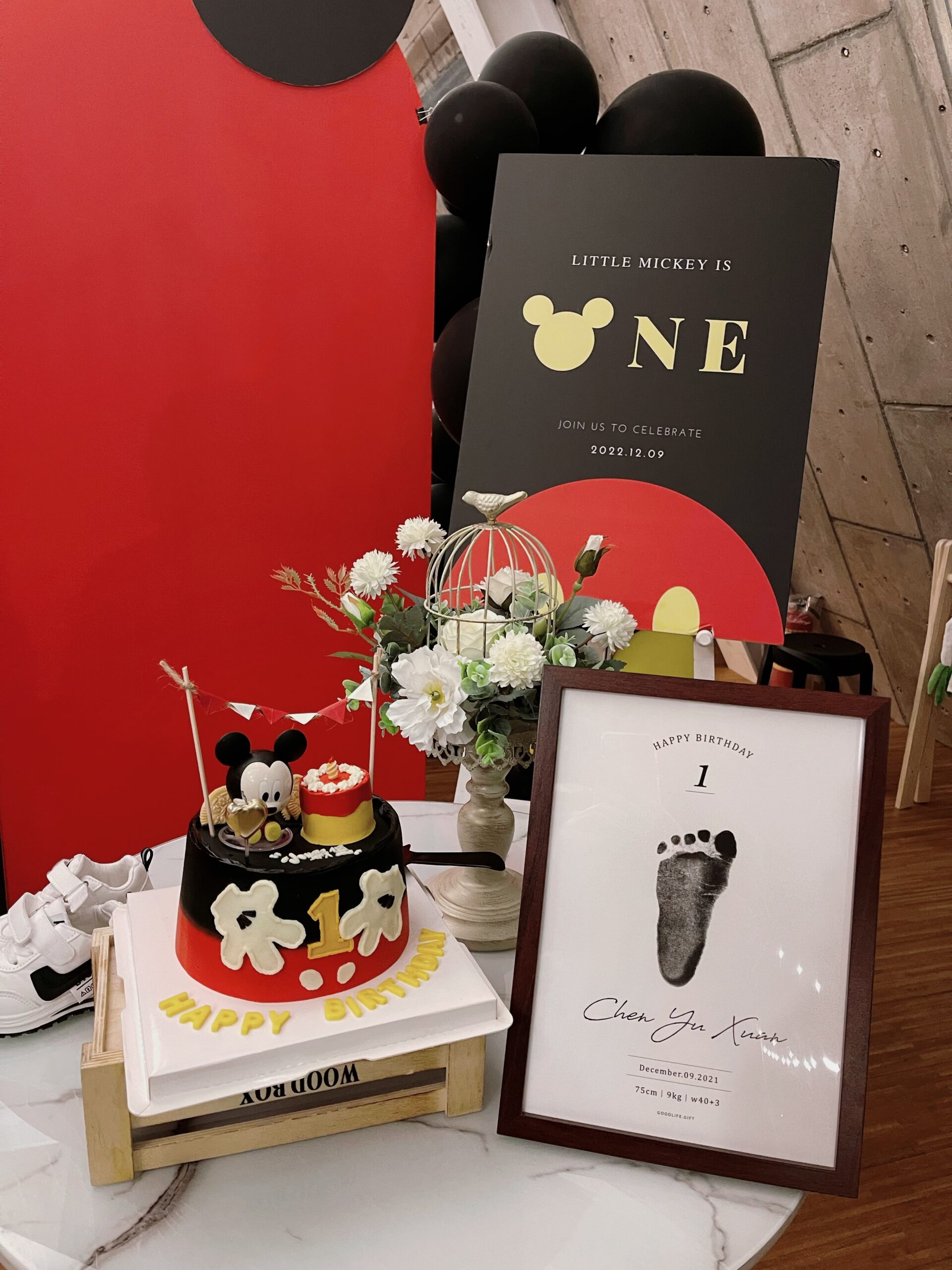 我們準備了一場米奇主題的抓周派對,經典紅黑黃主題配色